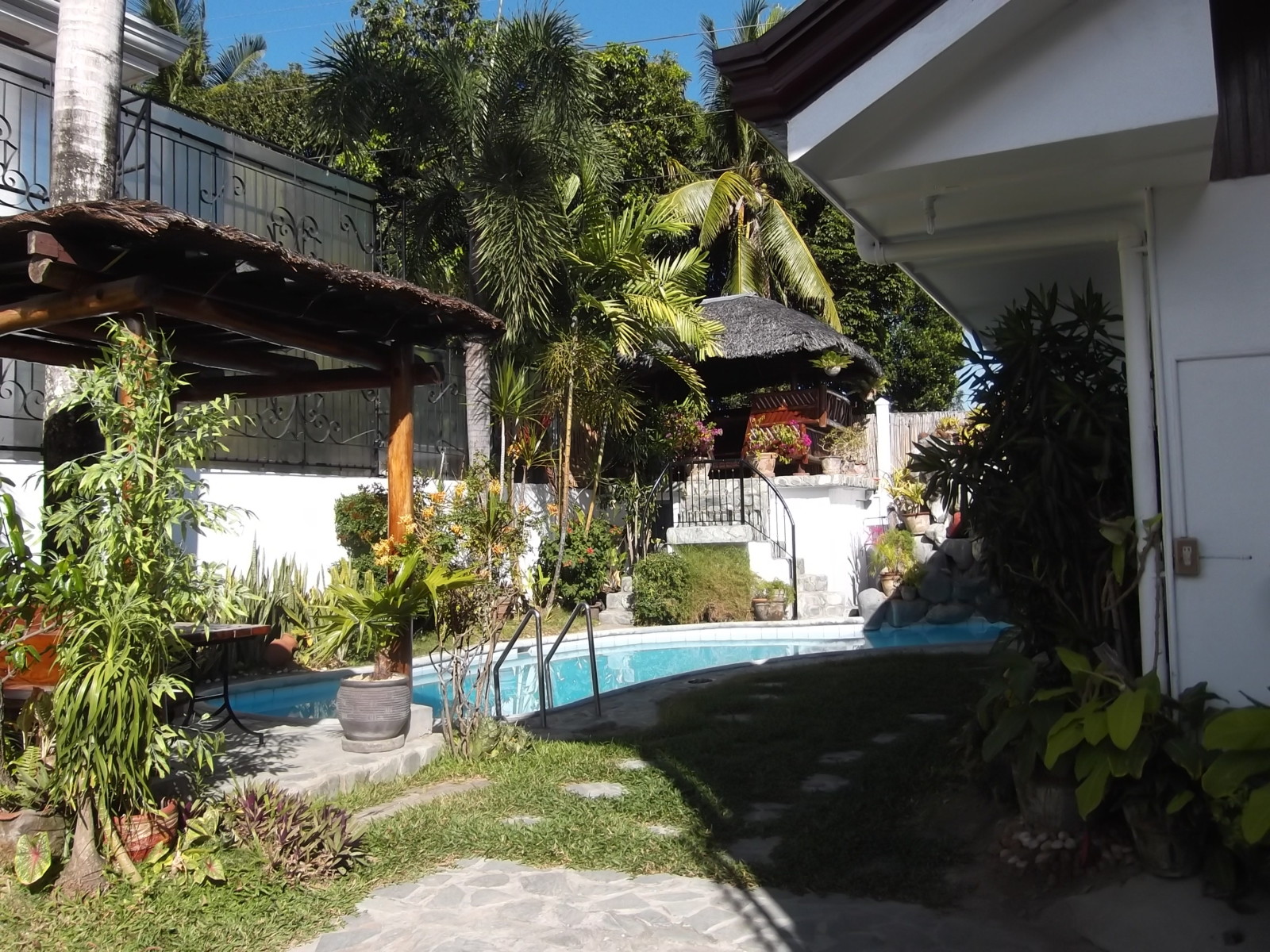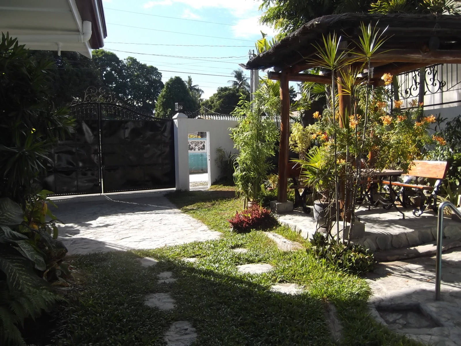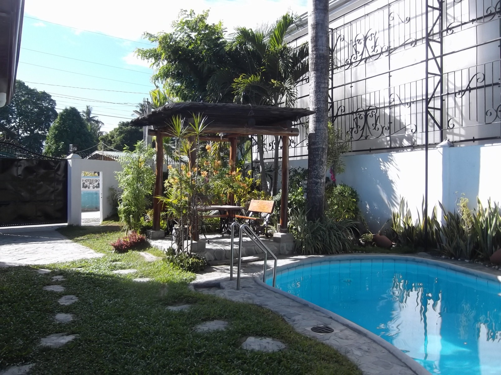 The property is designed with privacy in mind. One side features a firewall, while the other side has a polycarbonate fence with decorative grills, ensuring a secluded and peaceful setting. The outdoor area also includes two gazebos and a landscaped lawn, perfect for relaxing or entertaining guests.