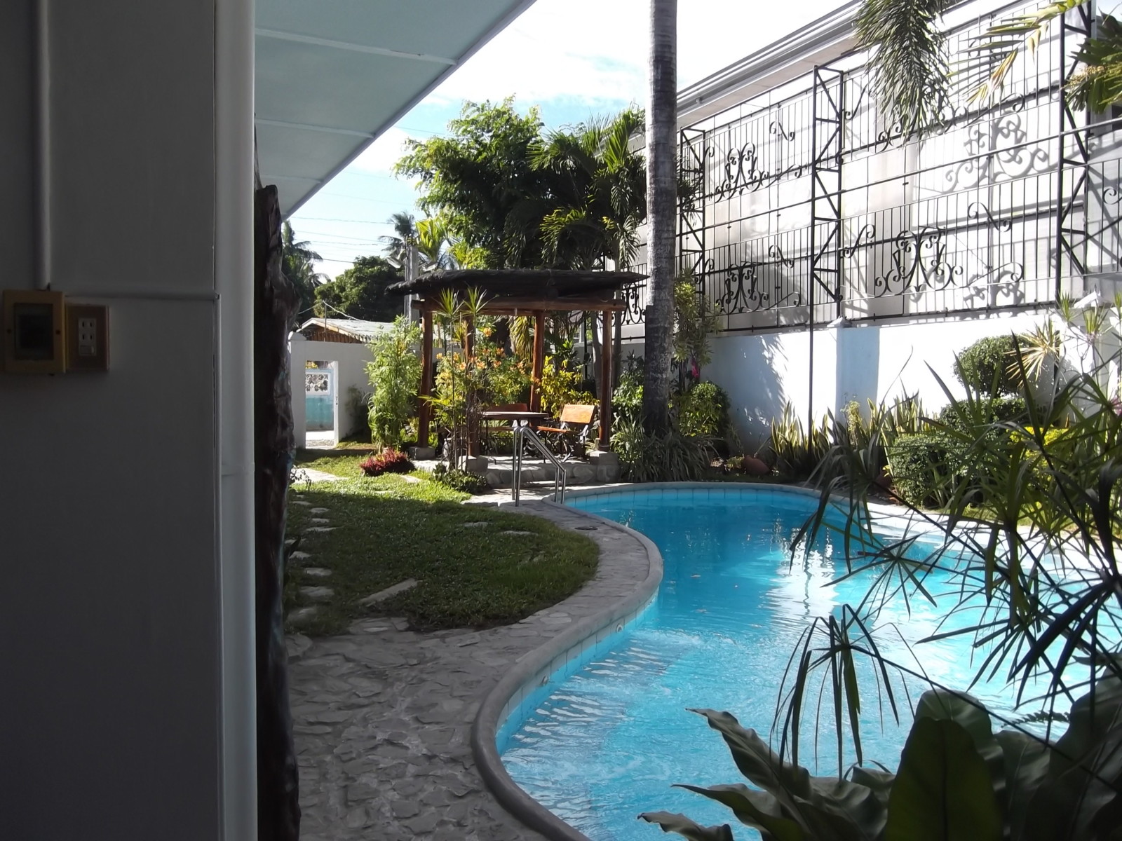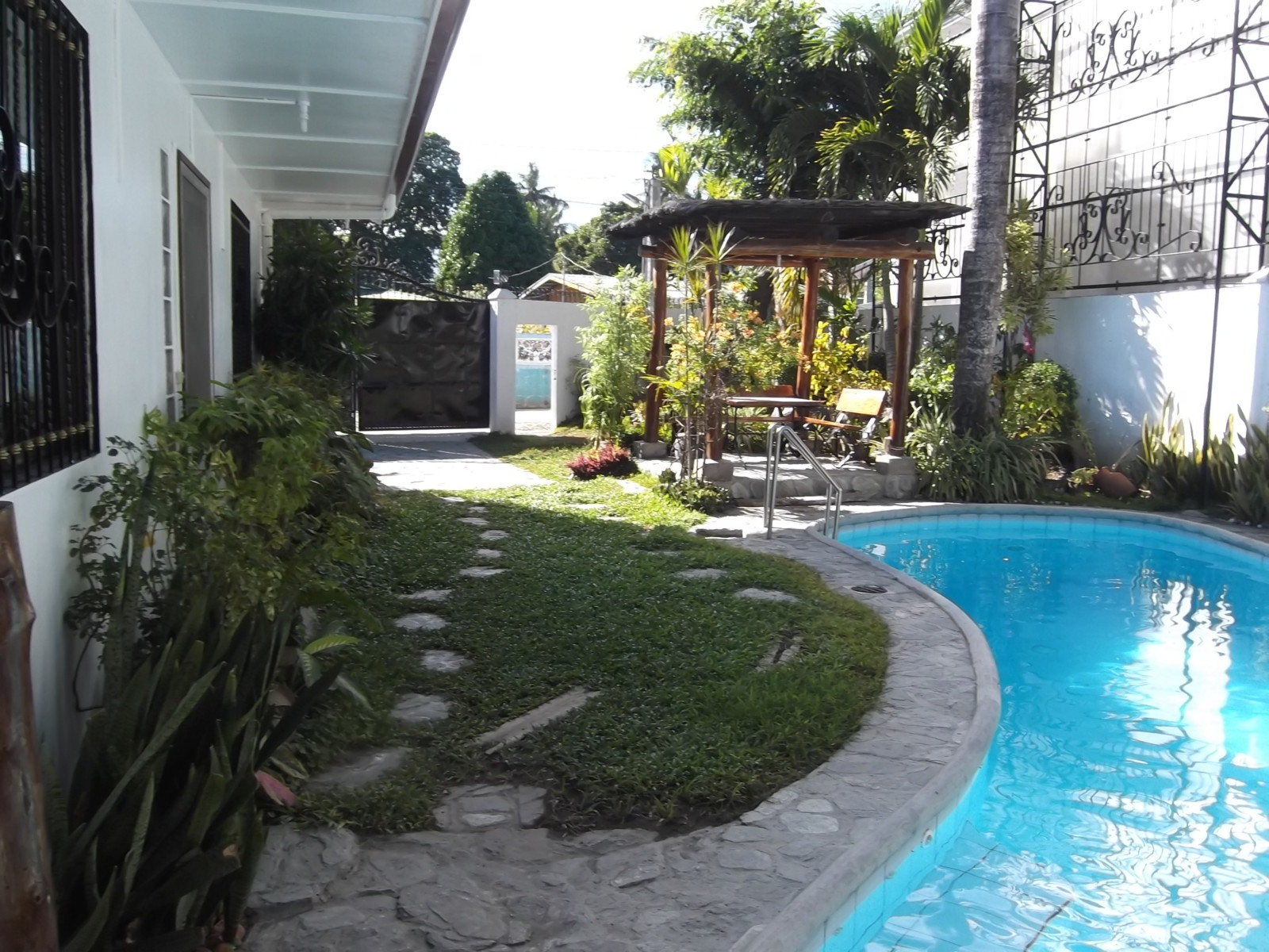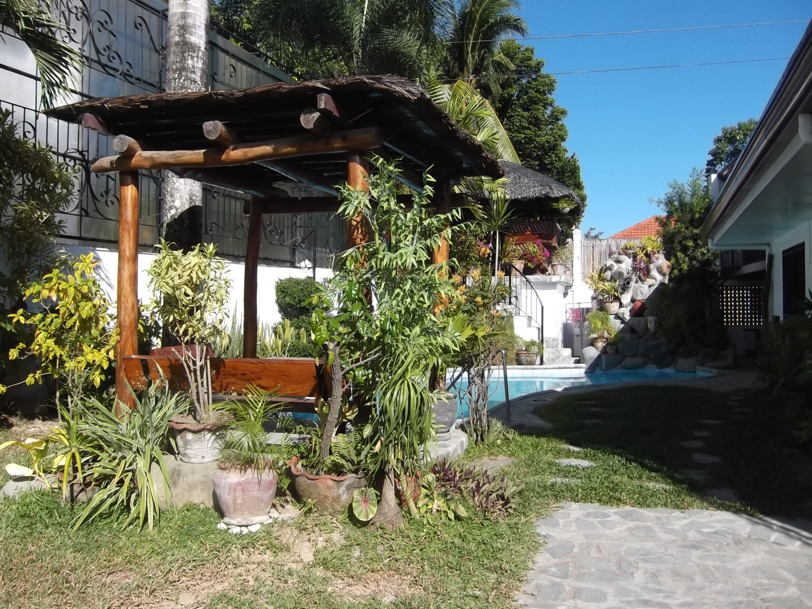 The property is designed with privacy in mind. One side features a firewall, while the other side has a polycarbonate fence with decorative grills, ensuring a secluded and peaceful setting. The outdoor area also includes two gazebos and a landscaped lawn, perfect for relaxing or entertaining guests.